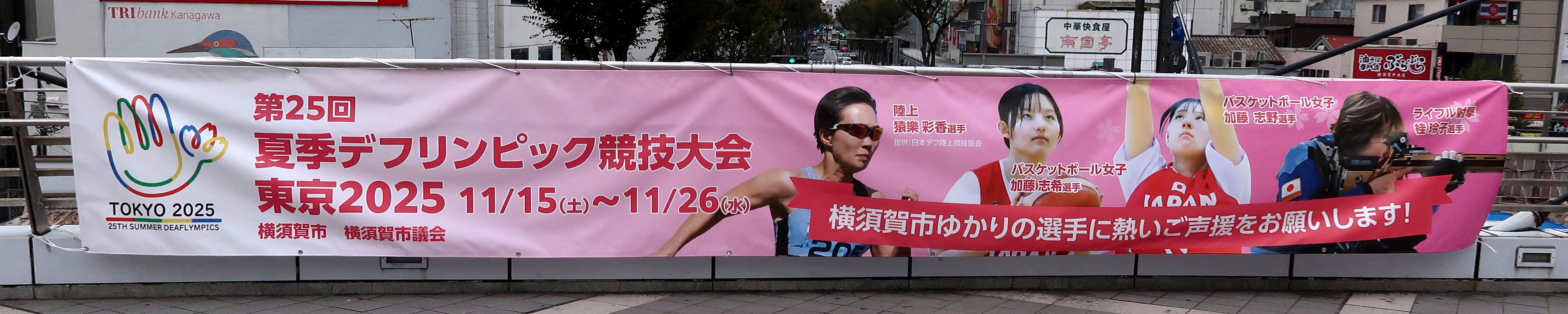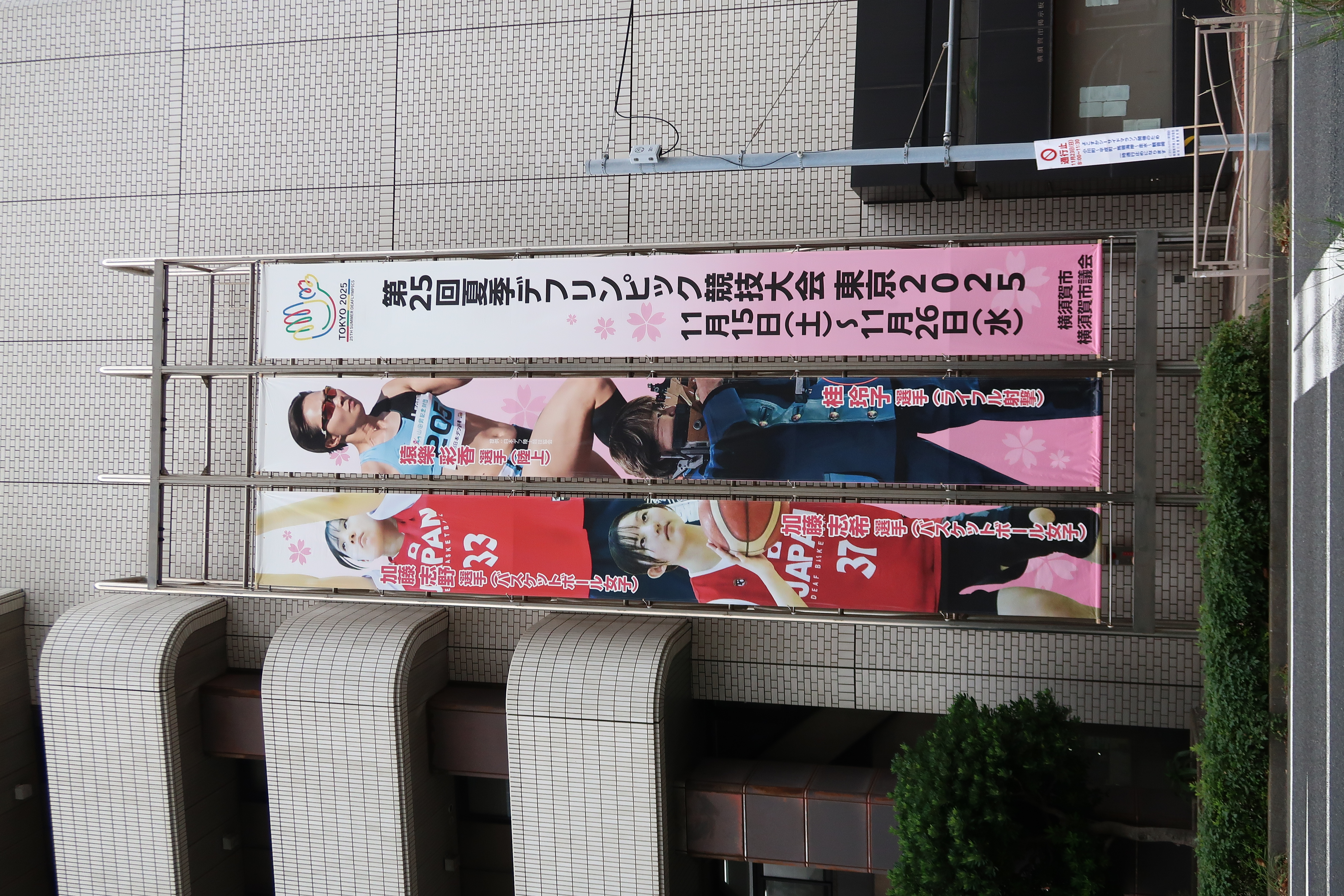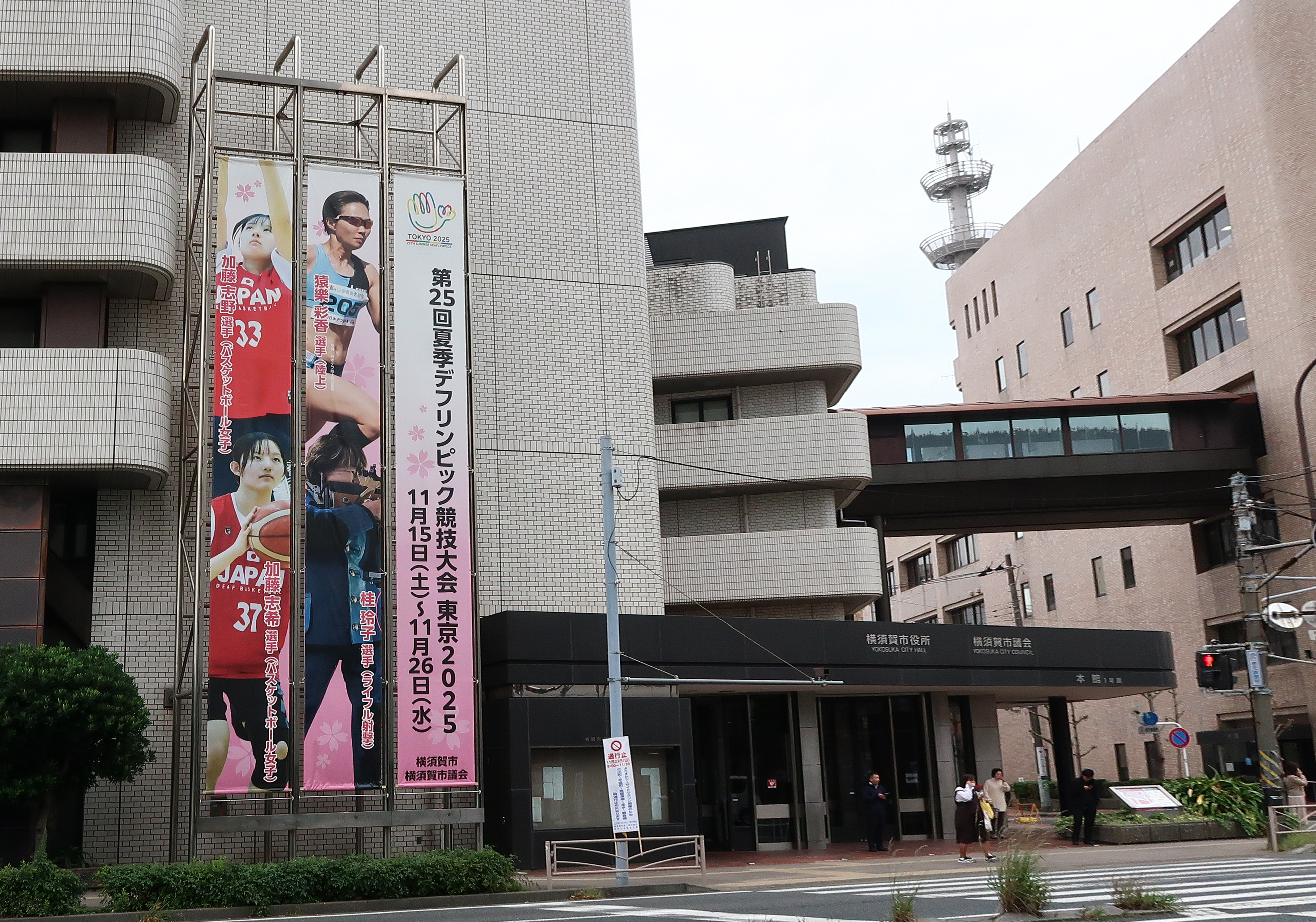 横須賀中央Yデッキと市役所に横断幕、懸垂幕が掲示されています